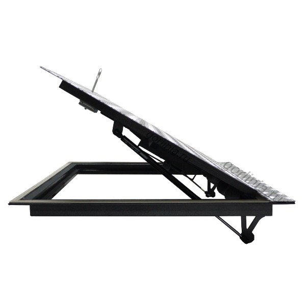 Крышка из алюминия подходит для бетонных полов, потому что не требует дополнительной отделки лицевой части в отличии от скрытых моделей из нашего каталога. Рама в габаритах 790х790 ставится полками уголка на горловину погреба, крепится анкерами по контуру плиты.