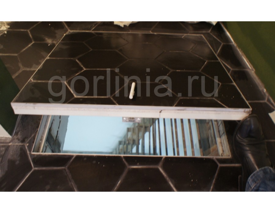 Скрытый напольный люк АМО из профильной балки 30х20 и равнополочного уголка 40х4мм окрашен порошковой эмалью в высокотемпературной камере. Интерьерное изделие оснащено газовыми стойками, скрытыми петлями и регулируемым замком со съемной ручкой. Тип открывания демпферной петли: распашной. Гипсоволокнистое полотно двери и наличник рамы выставлены в нулевую отметку под скрытую облицовку материалом отделки помещения.