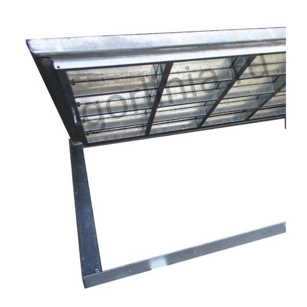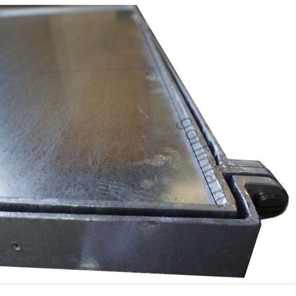 Рама сварена из сортового уголка 50х5. Каркас двери с внешним кантом выполнен с обвязкой из профиля 50х25 с ячейкой 300х300 в осях. Дно крышки закрыто оцинкованным листом 2 мм с расчетной глубиной 20 или 30 мм в зависимости от толщины доски декинга. Элемент петли реализован выносными разъемными шарнирами.