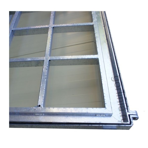 Рама сварена из сортового уголка 50х5. Каркас двери с внешним кантом выполнен в обвязкой из профиля 50х25 с ячейкой в осях 300х300. Дно крышки закрыто оцинкованным листом 2 мм с расчетной глубиной 20 или 30 мм в зависимости от толщины доски декинга. Элемент петли реализован выносными разъемными шарнирами.