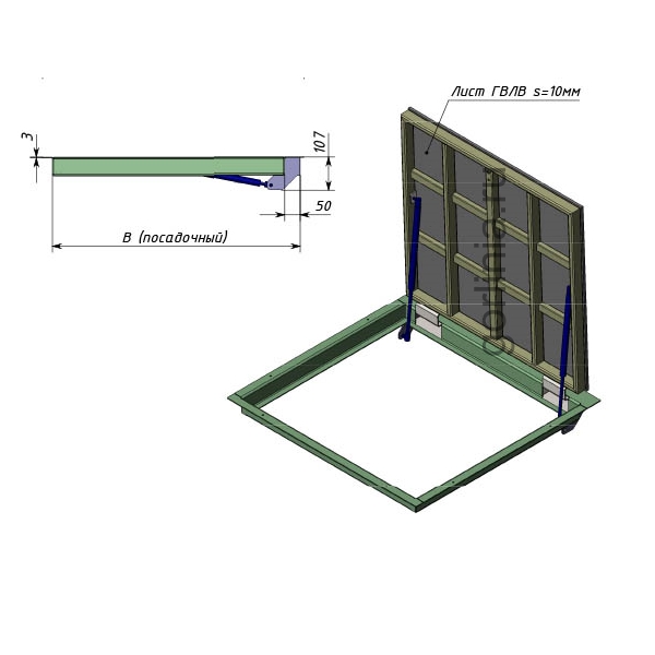 При подготовке напольного отверстия с зазором для посадки рамы 1200х600 обратите внимание на защитные кожухи шарниров и вылет полки наличника 10 мм со стороны петли. Изучите монтажные размеры на схемах в галерее.