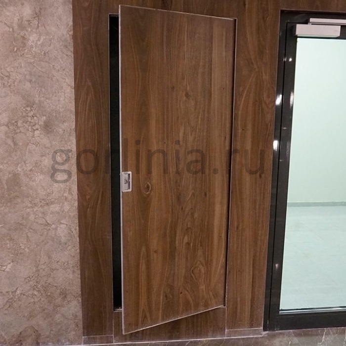 Монтажный размер 600*1600п со скрытой коробкой из алюминиевого профиля глубиной 62 мм. Полотно 552*1152 заполнено гипсоволокнистый лист влагостойкий "Knauf", внутри проложена минеральная вата и подшита ГСП-Н2 с внутренней стороны. По контуру притвора проклеена терморасширяющаяся лента.